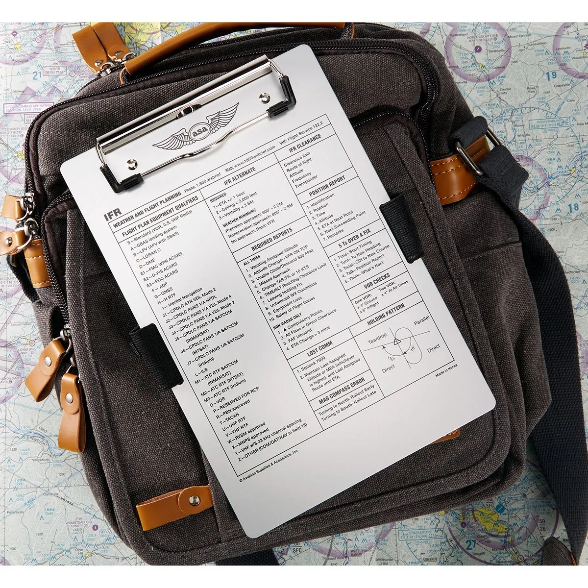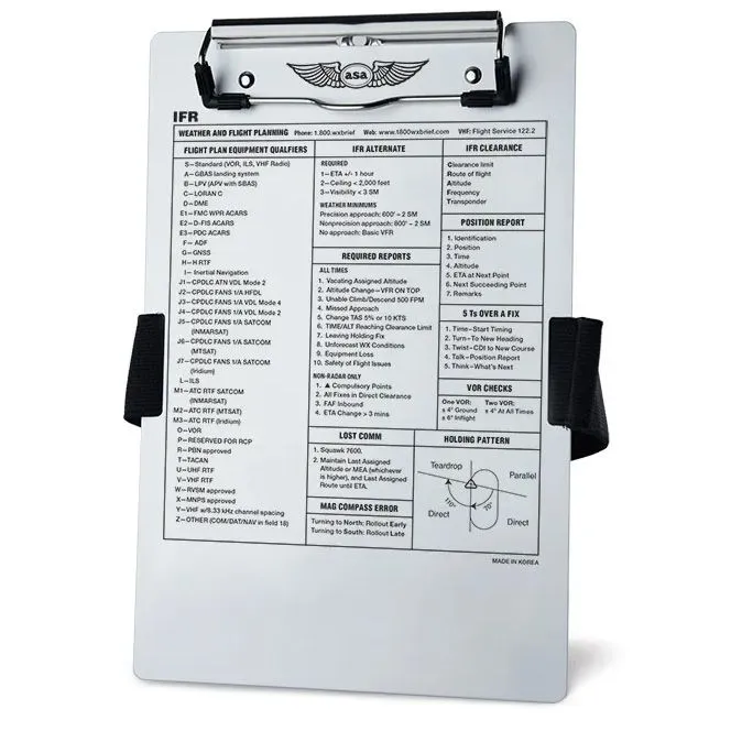 Información Técnica IFR Impresa: La base contiene datos vitales serigrafiados: frecuencias de emergencia, códigos transponder, holding patterns (patrones de espera), altitudes de crucero IFR y reportes de posición requeridos.