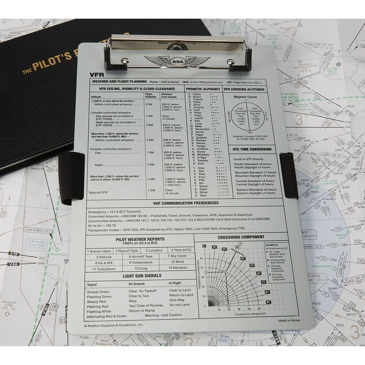 Información de Referencia VFR: La superficie incluye serigrafía detallada con datos críticos: alfabeto fonético, códigos de transpondedor, señales visuales de luces de torre, altitudes de crucero VFR y requisitos de visibilidad/distancia de nubes.
