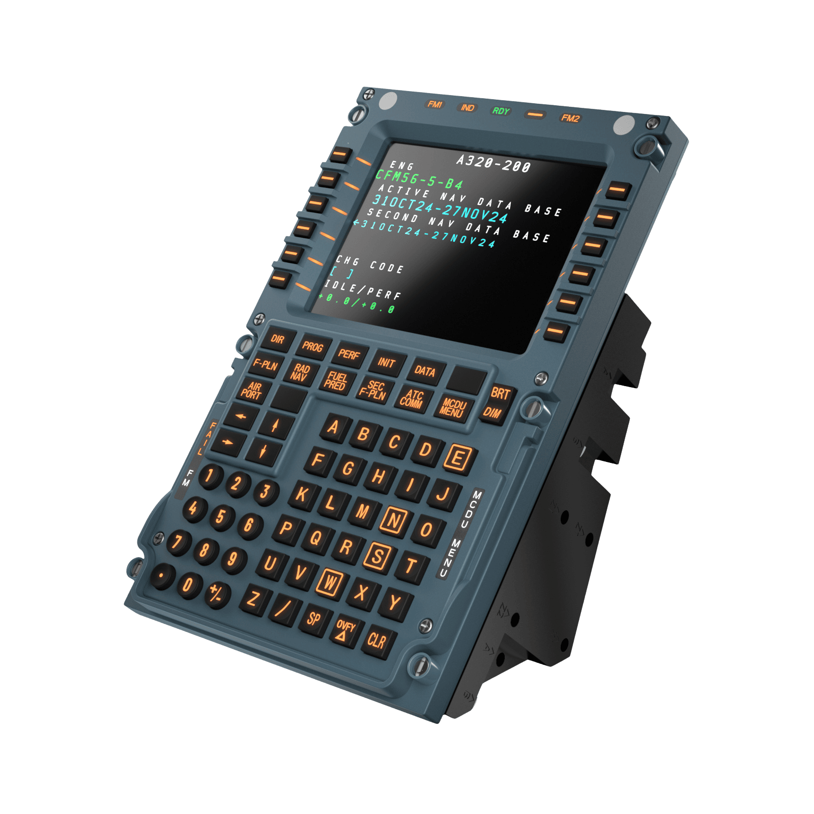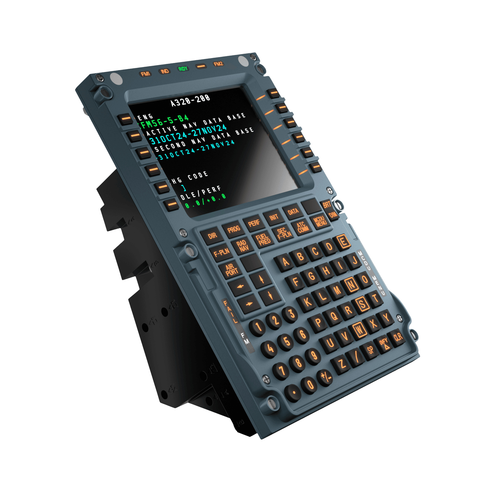 Unidad MCDU física con teclado integrado y pantalla para ingreso de datos de vuelo.